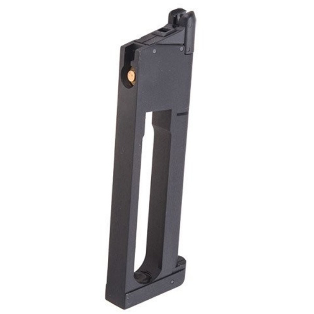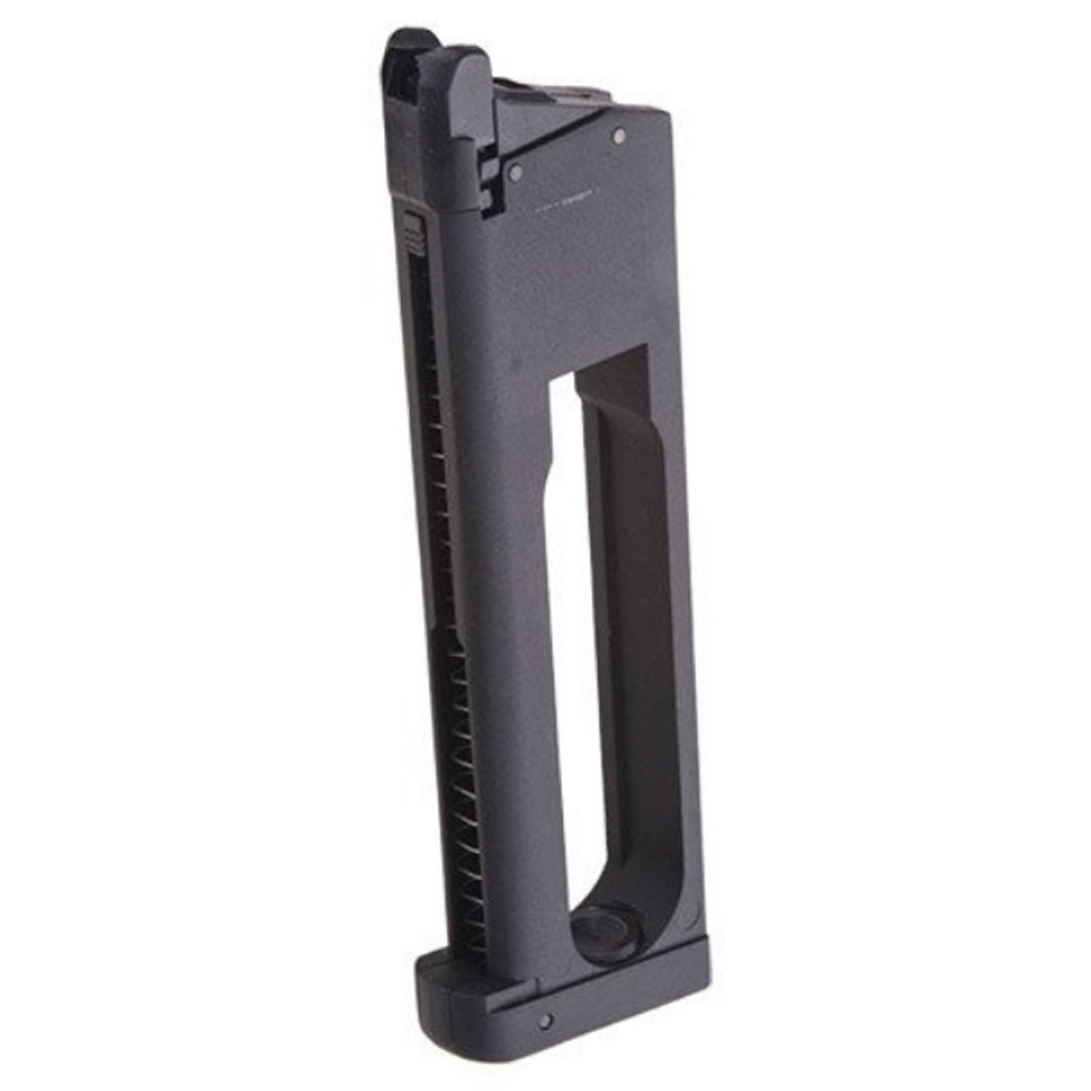 26rd standard CO2 magazine for KJ Works Model MEU KP-07 made with a Metal construction. This low profile bumper version offers better looks than the original thick bumper version of this magazine.