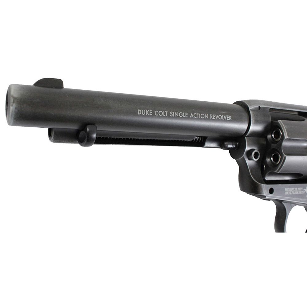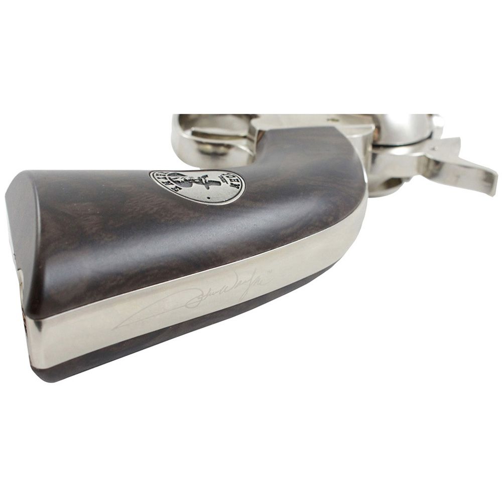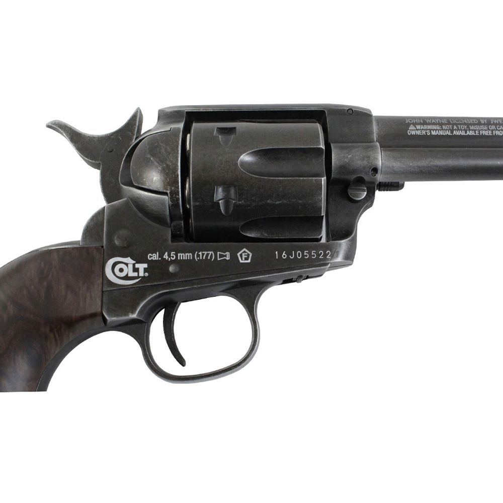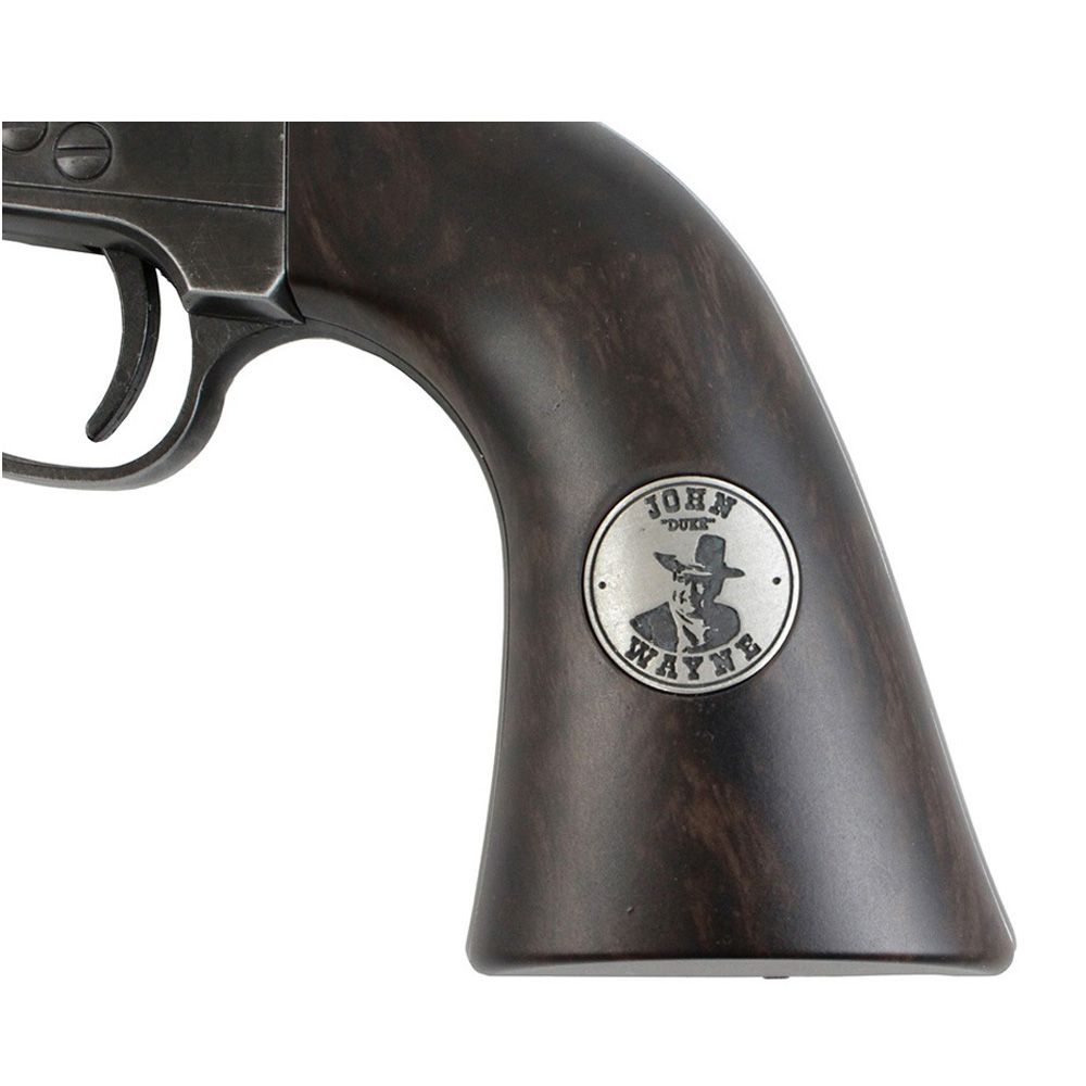 Comments: The Duke would be proud to have his name on this single action pellet revolver. High quality machined with a full metal frame and imitation wood grip, this .177 caliber six shooter looks, feels, and shoots just like a real steel Colt .45. It features an authentic rotating cylinder with a working ejector rod, brass cartridges, and a single action trigger system. The frame is engraved with authentic Colt trademarks, patent dates, and special markings unique to the John Wayne signature series. This pellet model has a rifled barrel that puts a spin on every round, providing deadly accuracy.