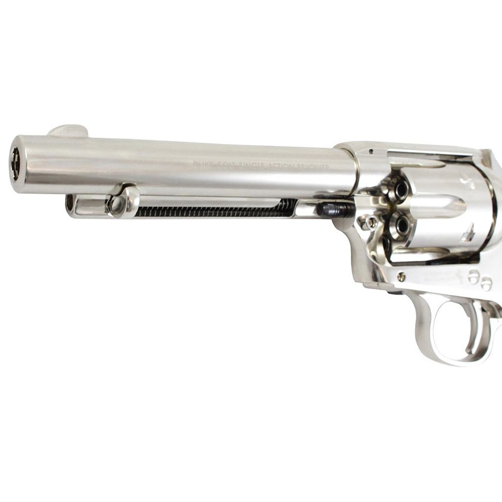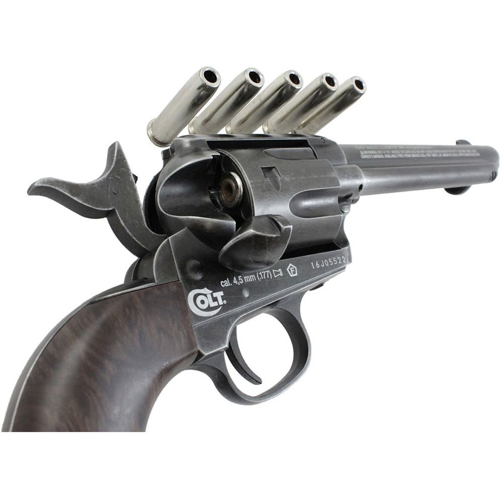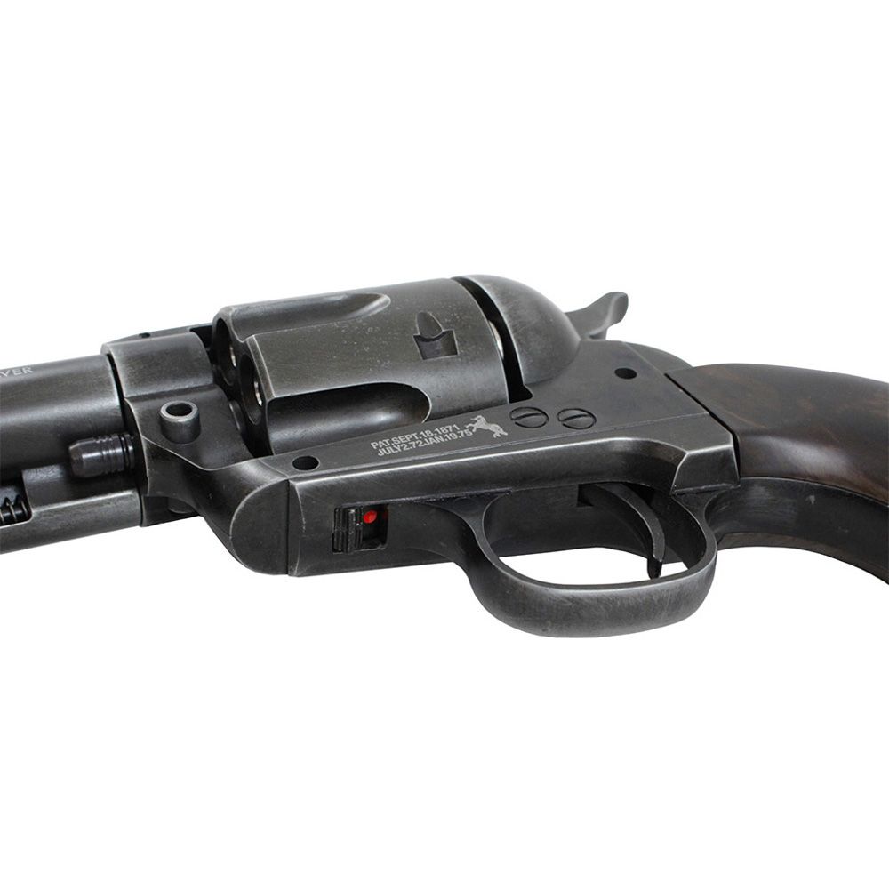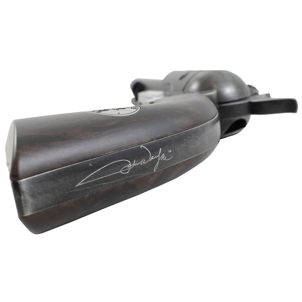 Comments: The Duke would be proud to have his name on this single action pellet revolver. High quality machined with a full metal frame and imitation wood grip, this .177 caliber six shooter looks, feels, and shoots just like a real steel Colt .45. It features an authentic rotating cylinder with a working ejector rod, brass cartridges, and a single action trigger system. The frame is engraved with authentic Colt trademarks, patent dates, and special markings unique to the John Wayne signature series. This pellet model has a rifled barrel that puts a spin on every round, providing deadly accuracy.