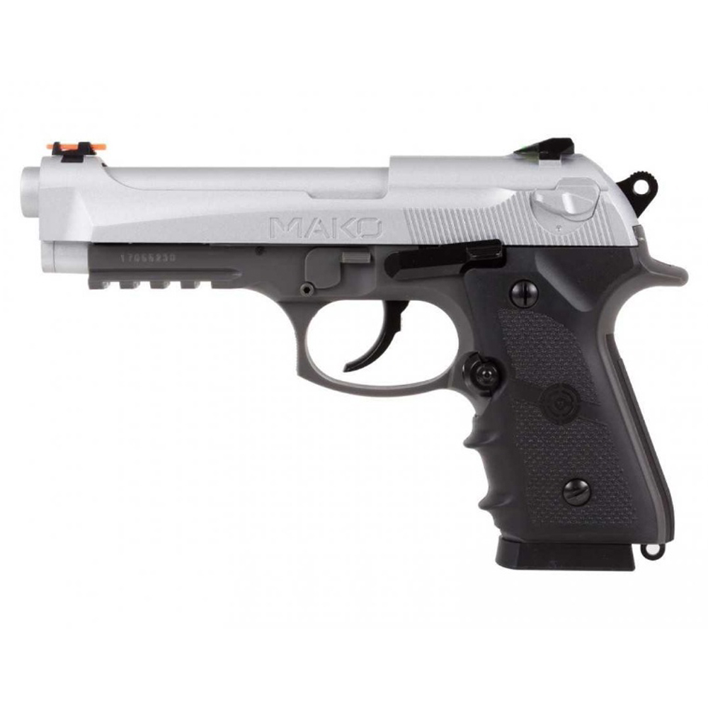 If youre looking for a great time shooting targets or plinking soda cans in your backyard, the Crosman Mako is a great place to start. Powered by a single 12-gram CO2 cartridge, this Beretta-style air pistol features a 20rd BB magazine that launches its BB payload at speeds up to 425 fps. Adding to the realism of the semi-auto fire is the realistic blowback action of the full-metal slide. The Makos fixed fiber optic sights ensure quick sighting of targets. As an added bonus, the built-in Picatinny/Weaver accessory rail gives you the option to mount a laser sight or flashlight for added tactical precision. If you want affordable semi-auto action, dive in with the Crosman Mako!