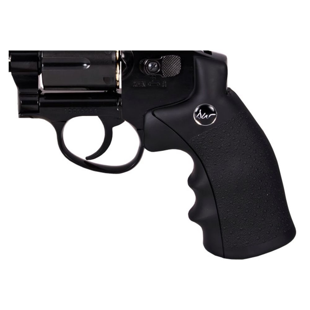 This 2.5” Black revolver licensed by Dan Wesson, offers realistic shooting fun in a handy size. It has authentic markings and a individual serial number stamped into the frame. The revolver features a double action trigger system and adjustable rear sight for extra realism and accuracy. The Dan Wesson revolver is made of metal except for the ergonomic grip constructed in hard ABS plastic. The 12g CO2 cartridge is stored in the grip and is easily accessed by sliding the grip back - easy-load style. Each of the 6 cartridges holds one 6mm BB and is placed in the metal cylinder that rotates as each round is fired. The revolver comes with speed-loader, attachable tactical rail and 6 cartridges.