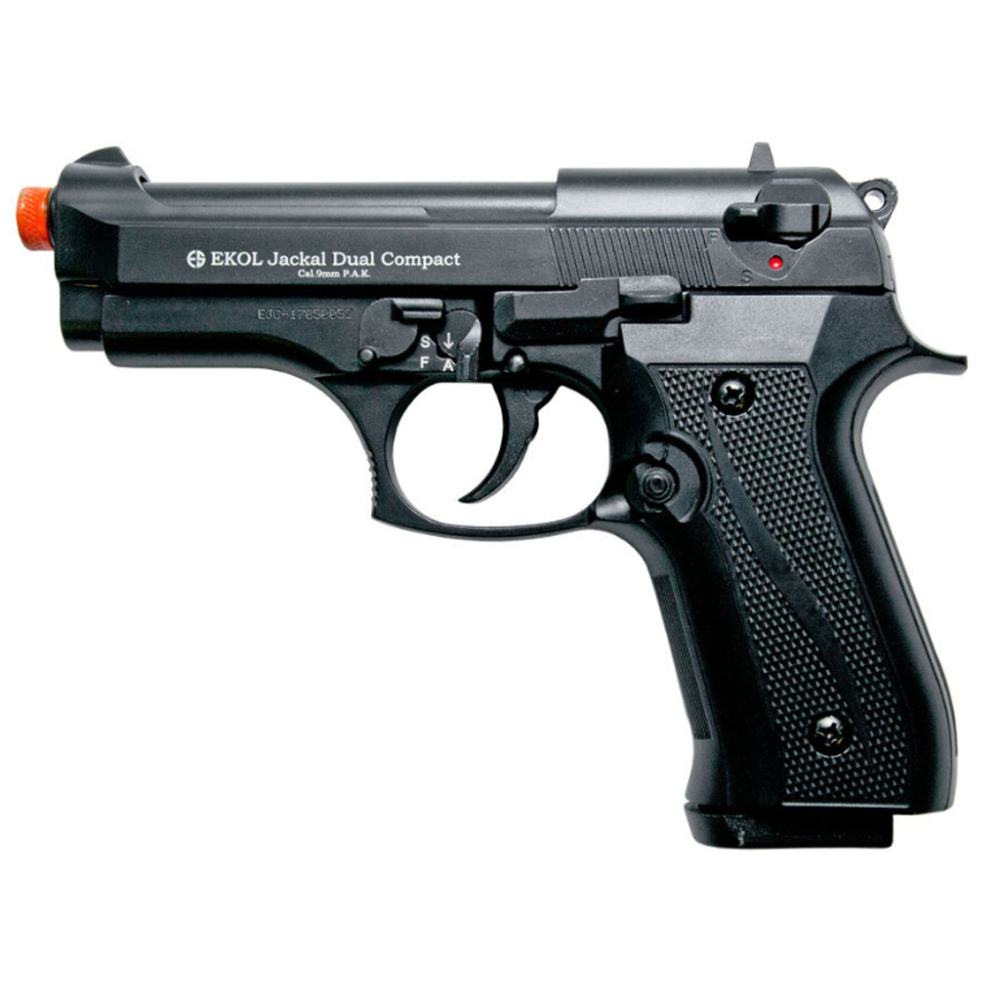 Type: Blank GunsManufacturer: EKOLModel: Jackal DualMaterials: Mostly metalWeight: 2.5 pounds (1.13 kg)Length: 8.46 inches (215 mm)Power Source: Gun powderAction: Semi/Full auto, single actionAmmo Type: 9mm PAK blanksAmmo Capacity: 15 rounds