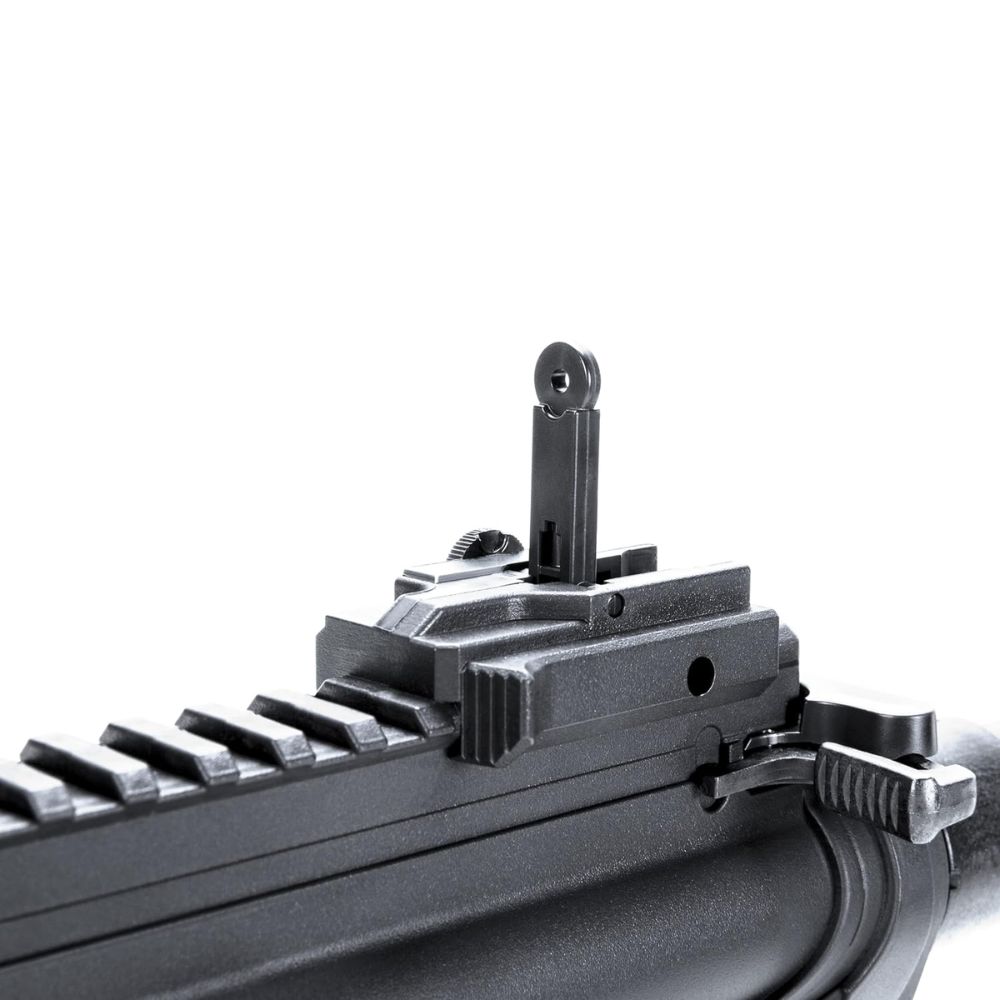 This air rifle is powered by two 12-gram CO2 cartridges located in the drop-out magazine, which has a 36-round capacity. A selector switch also enables a 6-shot burst mode for additional options for plinking fun. The look of this airgun is immediately recognizable to anyone familiar with the powder-burning model, especially the A5 variant, and brings shooters the feeling of the warfighting model without needing 5.56x45mm NATO cartridges.