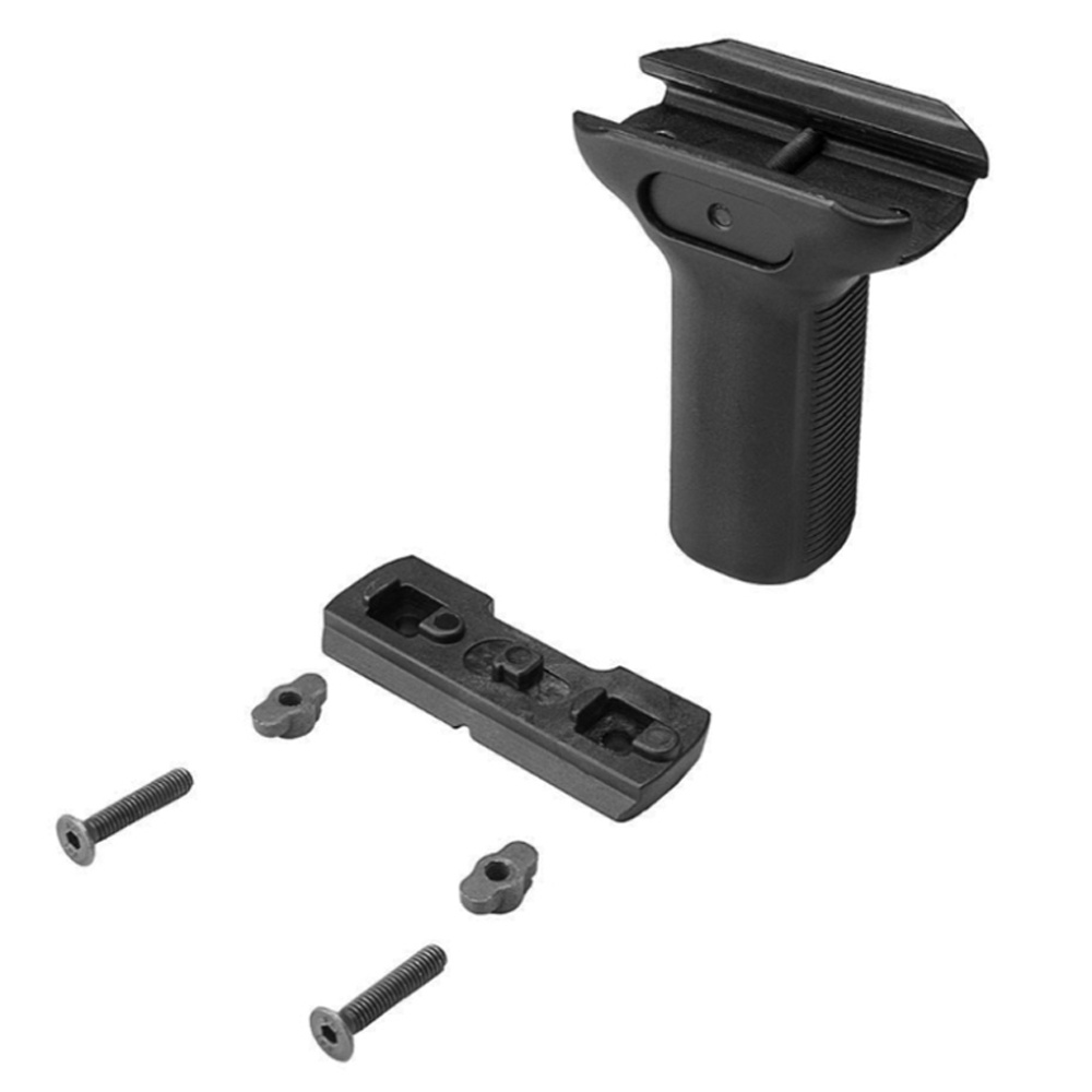 Comments: Made from black polymer, this tactical vertical grip enhances maneuverability of your weapon by giving you a natural angle to hold your gun. The texturing on the build prevents it from slipping in your hand and best part is that it can also be transitioned to fit different mounting surfaces. Using the two T-nuts, you can either mount it onto KEYMOD™ and M-LOK® slots or simply remove them to grip it directly onto most weaver, Picatinny or Mil-Std 1913 rails via the aluminum side clamp and bolt.