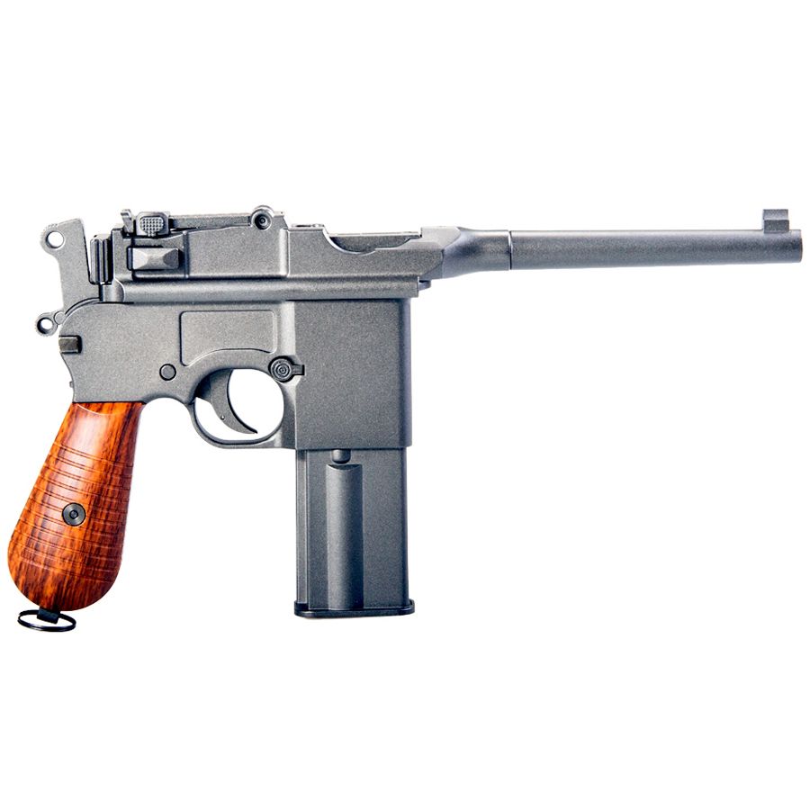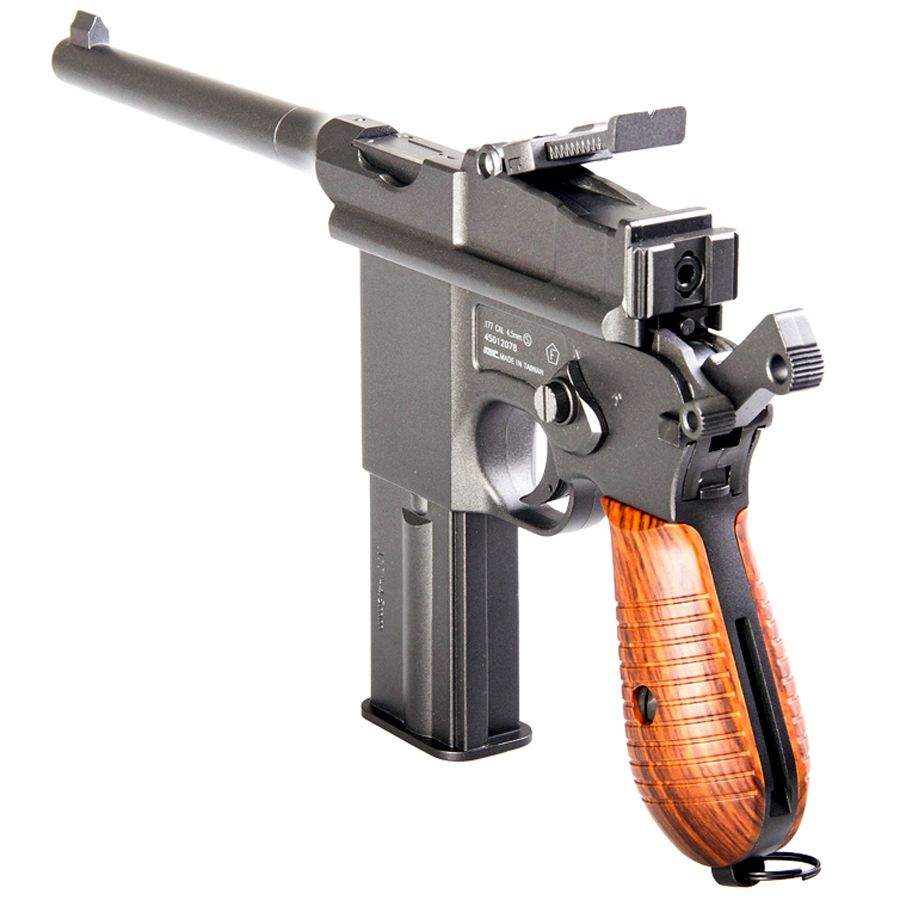 Realism: The KWC M712 BB Gun is spot on replica of the M1932/M712 Schnellfeuer with all the same working parts including the semi and full-auto selector switch. The pistol also has a full working bolt, hammer, safety, adjustable rear sight, and a full size drop out metal magazine that holds the CO2 and BBs.