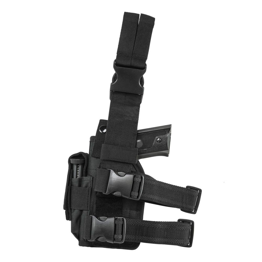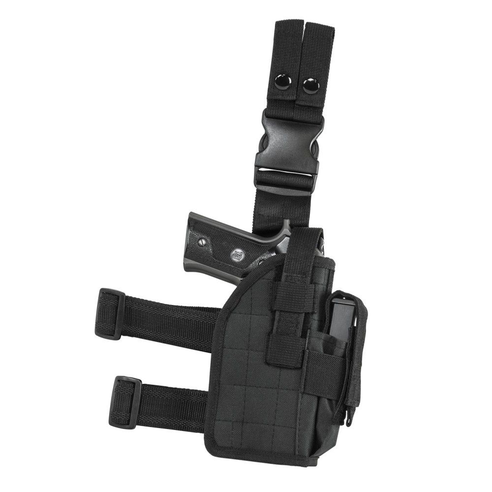 - This Universal Holster features an adjustable Thumb Snap to secure your pistol in the holster, a single Magazine Pouch on the front edge of the holster, two adjustable slip resistant Thigh Straps with Quick Release Buckle, adjustable for height Drop Leg Strap with Quick Connect Buckle, and dual Belt Loops with thumb snaps.