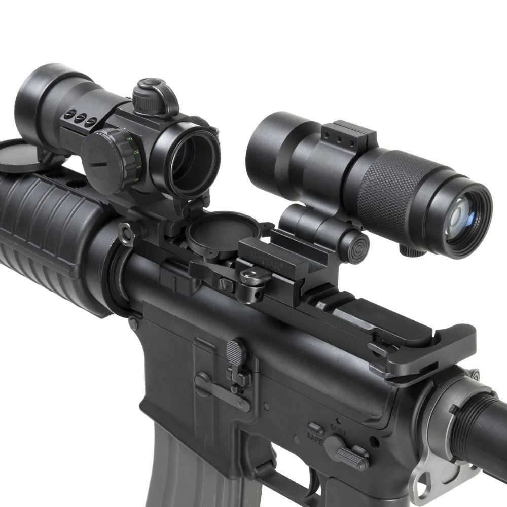 Intensify your gun’s performance with NcStar 3x Magnifier. Replica air gun offers you this highly recommendable product at a very affordable price, an opportunity not to be missed. At a ½" AR15 height centerline, this magnifier will align perfectly with your reflex sight. This will allow to use your red/green/ blue dot in the same basic way while being able to magnify your distant target range up to 3 times for better accuracy. When not it use it can be easily flipped to the side and back again to its position to re-engage your longer distance target and get you back on target instantly. Made of black anodized aluminum, it will definitely guarantee you years of use with its anti-corrosive robust body. Equipped with a quick release mount will also make this accessory clamps onto any Weaver, Picatinny and MIL-STD 1913 type rails.