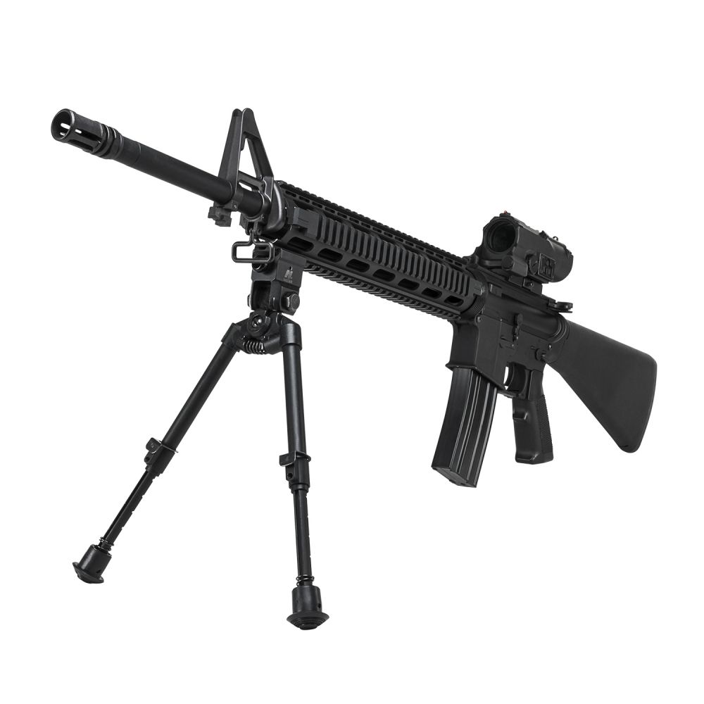 - Bipod legs can be folded together and moved into a horizontal rest position