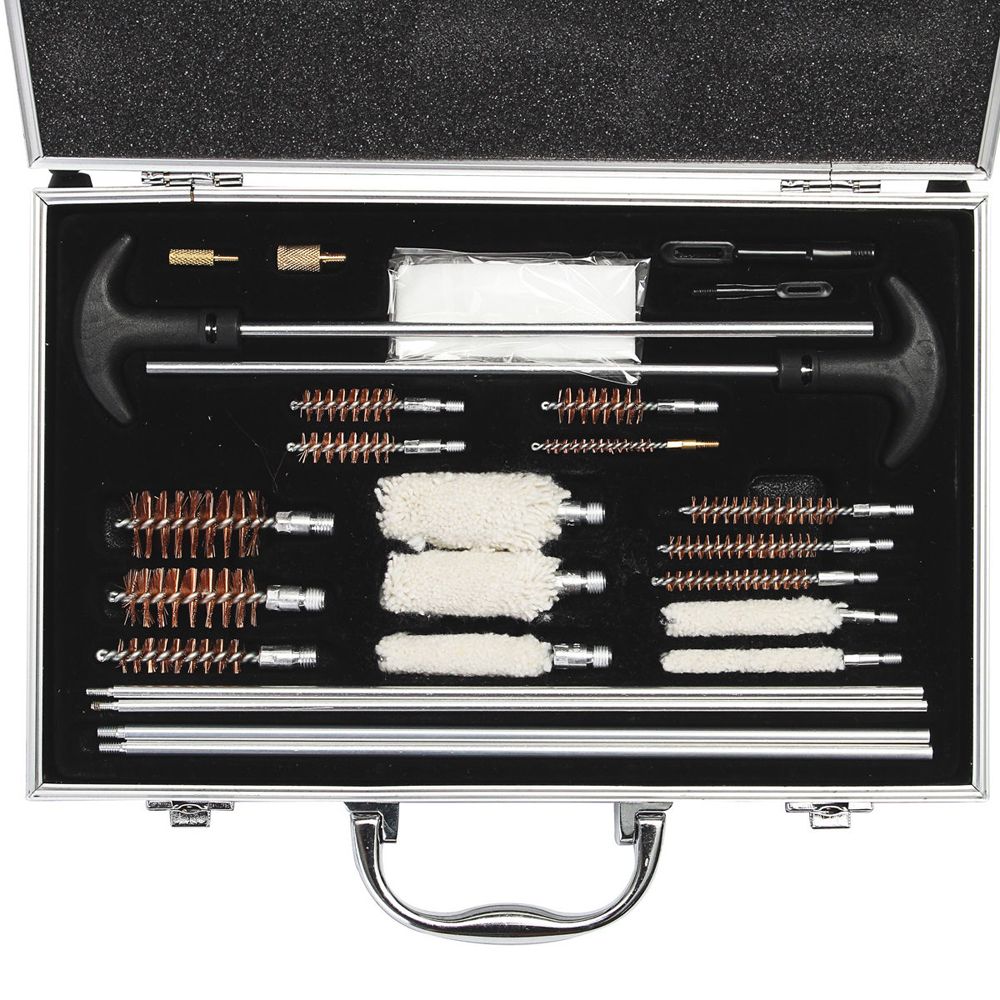 Replica air gun offers you a universal gun cleaning kit from a famous brand like Ncstar which comes with a variety of components inside a stylish sturdy metal case to cater for a wide range of weapons. Kit consists of 2 sets of cleaning rods, 2 rod adapters, plastic t-handle for sure grip, 2 slotted tips for patches, cleaning patches, 10 bronze bore brushes and 5 bore mops.