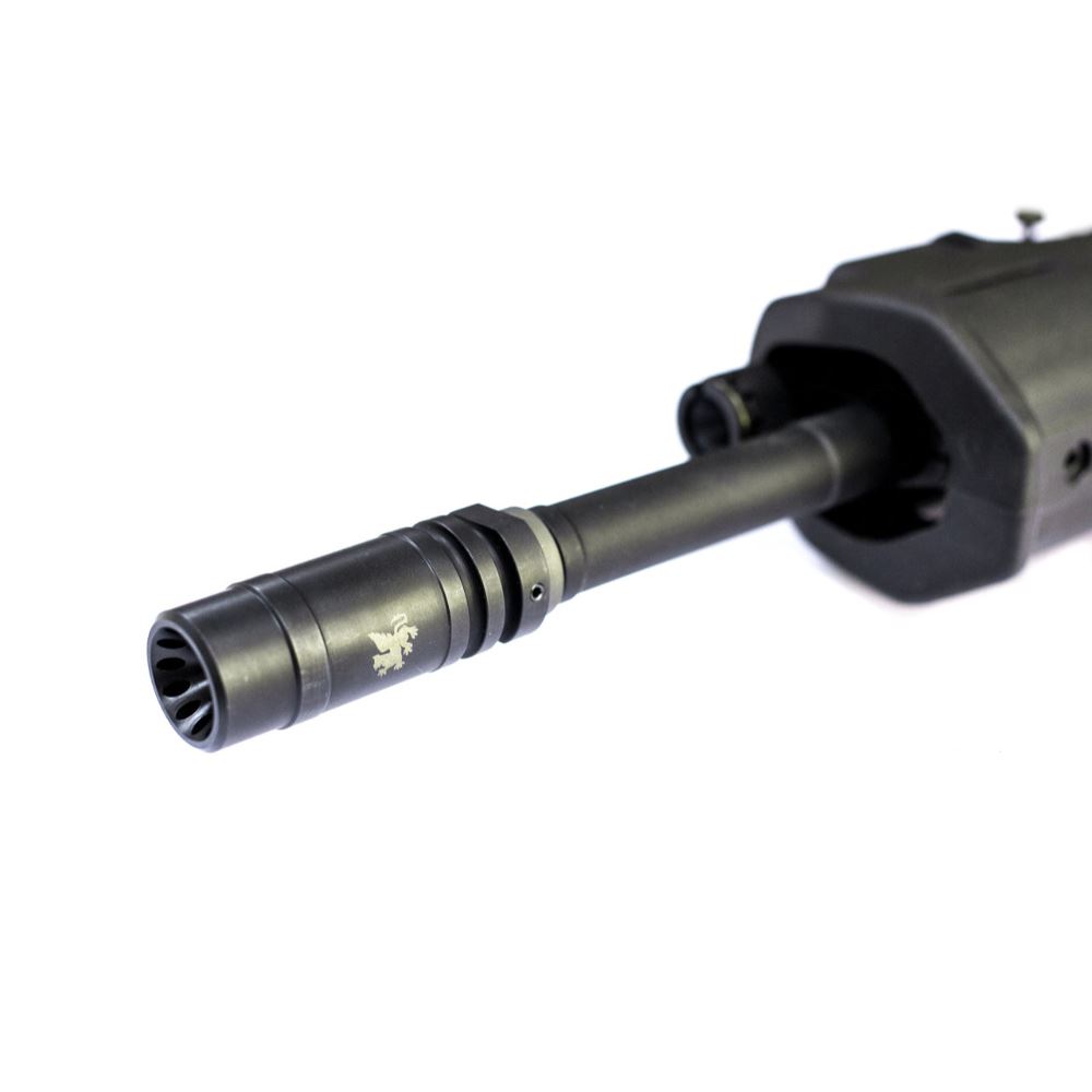 Comments: This Airsoft version has been designed to be compatible with any A2-compatible suppressor mount including the PTS Griffin Armament M4SD Suppressor. It features three ports on top for muzzle neutrality as well as a de Laval nozzle in front to project linear flow of pressure down range. This model doesn’t include any side ports.