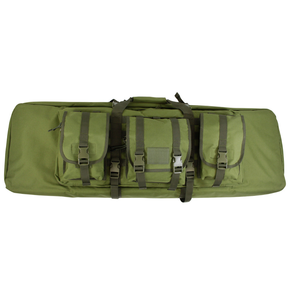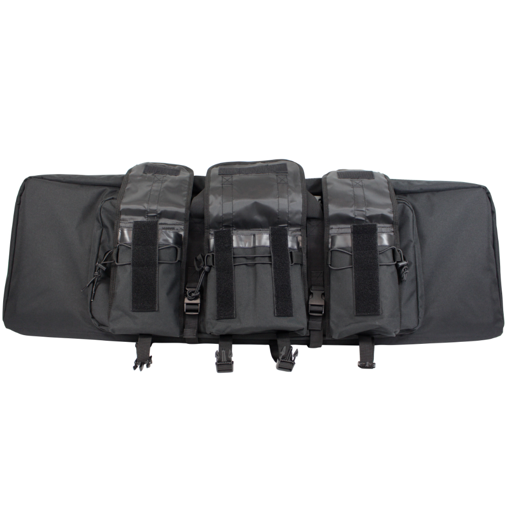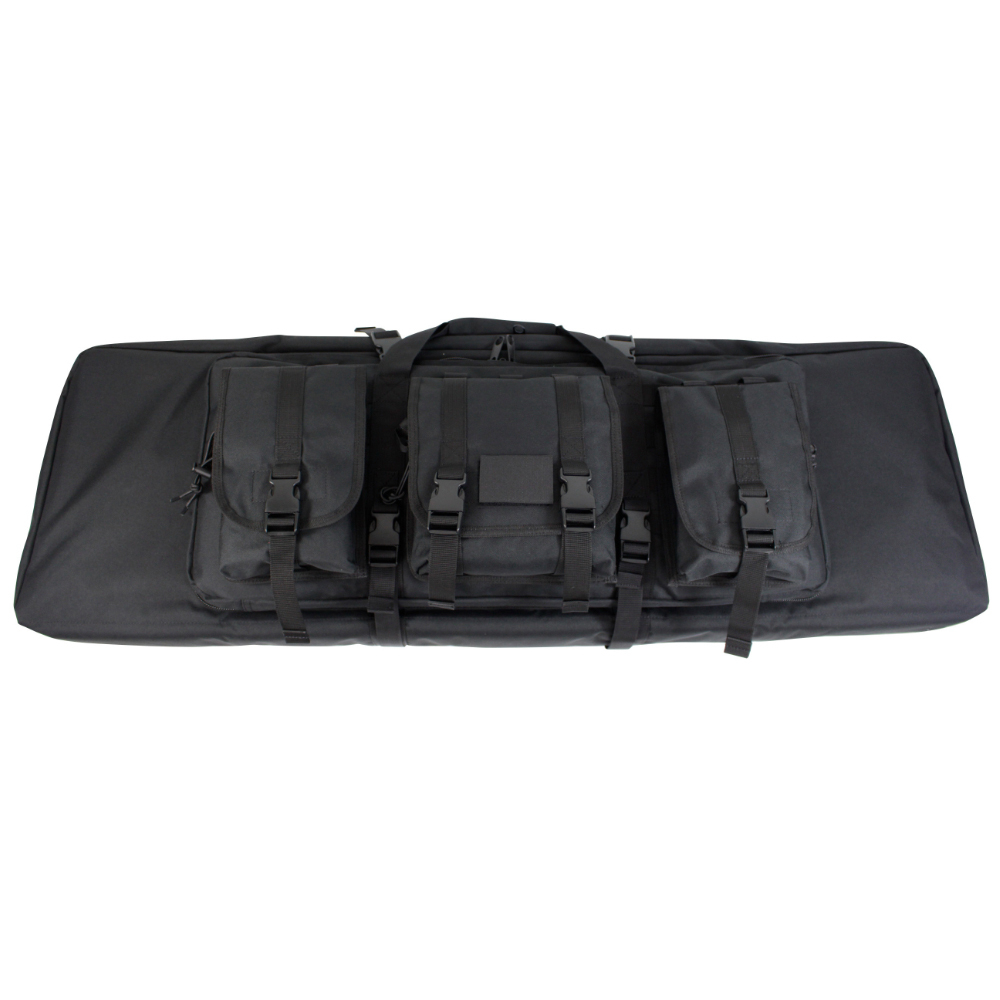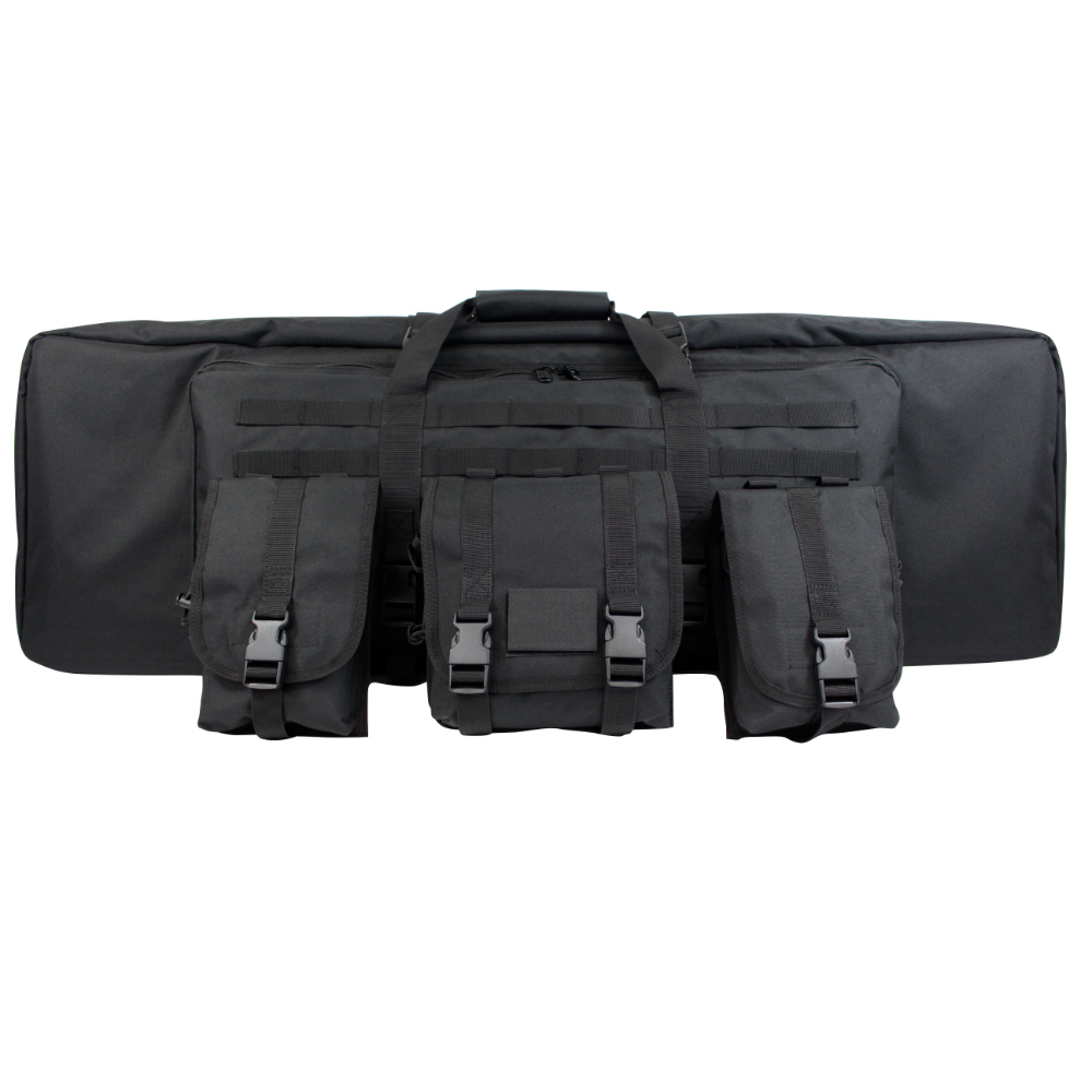 The Raven X combat-ready ultimate double rifle bag is the perfect carrying device and storage for your hunting, simulation war gaming, and training equipment. Constructed of high-quality water/dust resistant material, the double rifle case features a dual-rifle main compartment with integrated padded dividers and hook & loop straps to secure your rifle. This dual-weapon case is fully padded for maximum protection with an additional 26" front compartment for 2 pistols, optics, SMG, or other accessories. It comes with 3 outside pouches that combine to hold up to 14, M4 magazines. Other features include heavy-duty zippers, backpack straps for slick transportation, QD buckles, internal pistol holders, adjustable straps, robust carrying handles, MOLLE webbing, and zippered tool compartment.