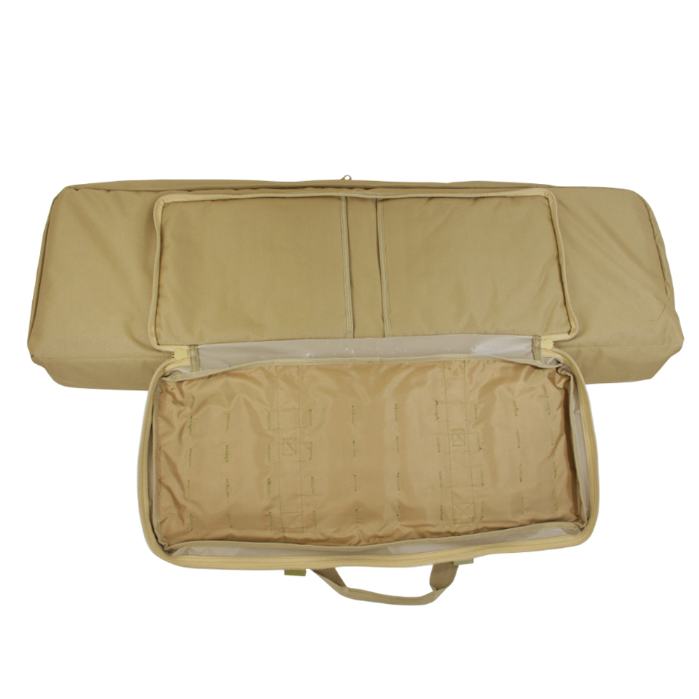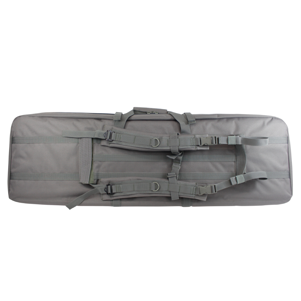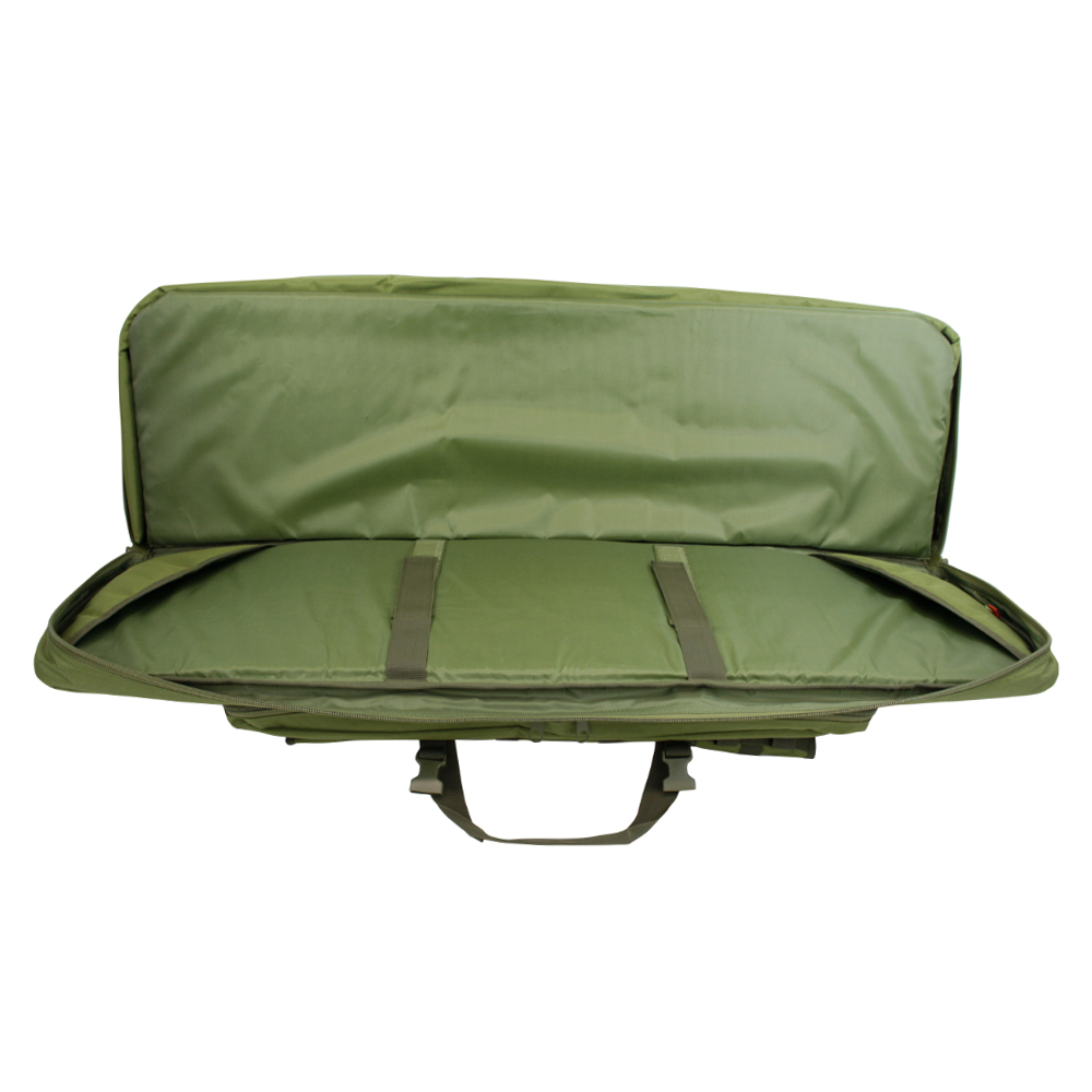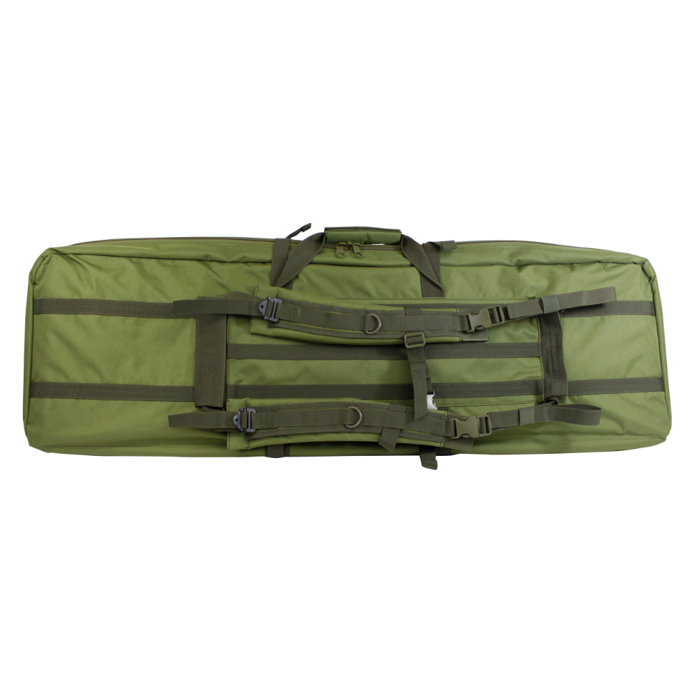 The Raven X combat-ready ultimate double rifle bag is the perfect carrying device and storage for your hunting, simulation war gaming, and training equipment. Constructed of high-quality water/dust resistant material, the double rifle case features a dual-rifle main compartment with integrated padded dividers and hook & loop straps to secure your rifle. This dual-weapon case is fully padded for maximum protection with an additional 26" front compartment for 2 pistols, optics, SMG, or other accessories. It comes with 3 outside pouches that combine to hold up to 14, M4 magazines. Other features include heavy-duty zippers, backpack straps for slick transportation, QD buckles, internal pistol holders, adjustable straps, robust carrying handles, MOLLE webbing, and zippered tool compartment.