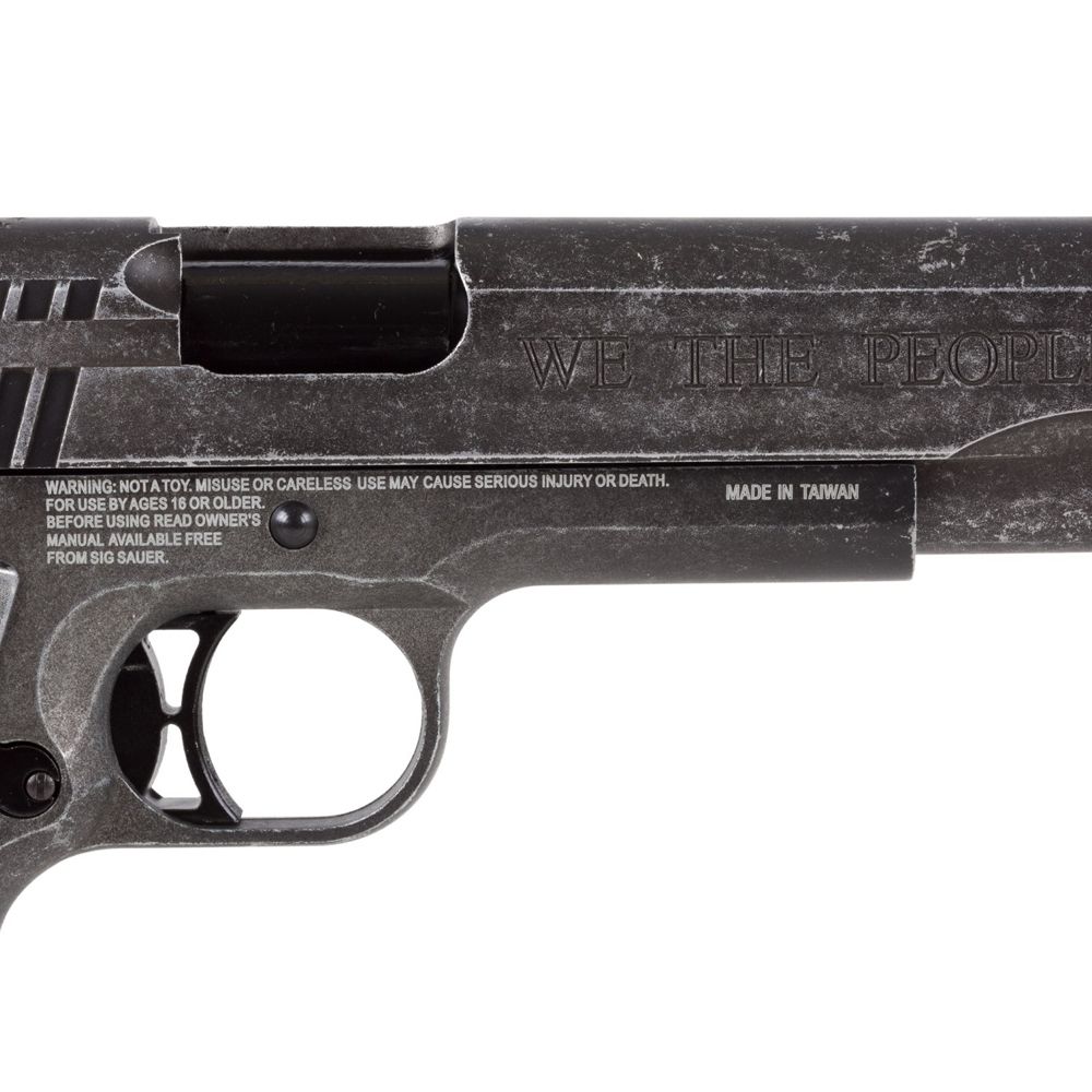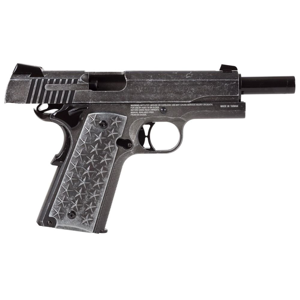 This 1911's all-metal body sports a weathered finish as rugged as Old Glory herself. Emblazoned with a stars and strips grip pattern, 50 raised stars await your sure grip. With a design destined for only the most patriotic backyard shooting sessions, each slide is etched with a ring of 13 stars, the date "1776", and the phrase "We the People", Thomas Jefferson's timeless intro to the Declaration of Independence.