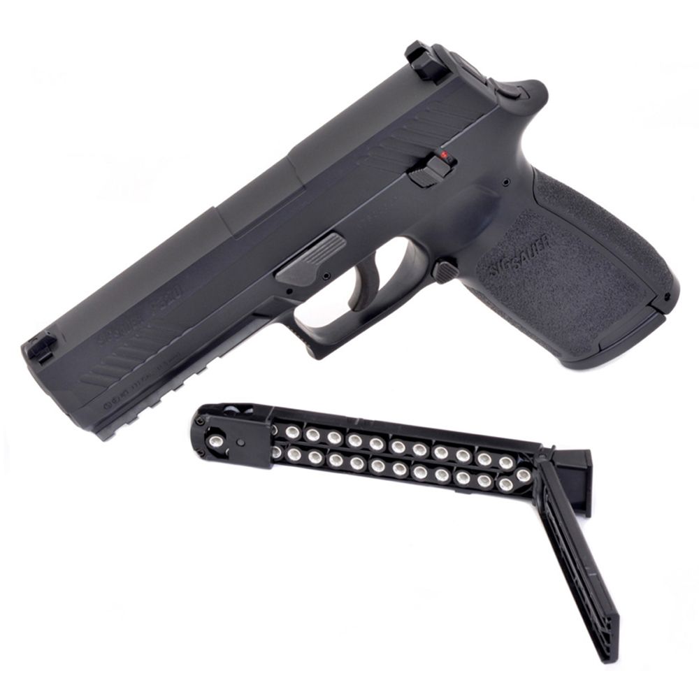 Type: Air Pistol. Manufacturer: Sig Sauer ASP Model: Sig Sauer ASP P320. Materials: Metal and plastic build. Weight: 1.81 pounds (821 Grams). Barrel: 4.75 inches - Rifled steel. Propulsion: 12 gram CO2. Action: Blowback single and double action. Ammunition Type: .177 caliber pellets and 4.5mm Steel BB's. Ammunition Capacity: 30 round belt fed stick magazine. Max FPS: 430 I was happy when Sig Sauer released their ASP Sig P250 and P226 CO2 Blowback Pellet Pistols with their 16 round double sided stick magazines like we have seen in several otters CO2 Pellet Pistols. But I love the introduction of the 30 round belt fed magazine. I am hoping the belt fed magazine performs while actually shooting pellets as good as it feels when dry firing it, I guess we will have to wait and see when I do my Field Test Shooting Video :) Overall the new Sig Sauer ASP P320 Pellet Pistol looks to be an upgrade of sure to the P250 in terms of improved weight and a higher capacity magazine. Read full article here: https://www.replicaairguns.com/2017/6/2/sig-sauer-asp-p320-co2-blowback-177-caliber- Buy Sig Sauer Airguns in our Canada Store: https://www.replicaairguns.ca/search?q=sig+sauer Buy Sig Sauer Airguns in our US Store: https://www.replicaairguns.us/search?q=sig+sauer