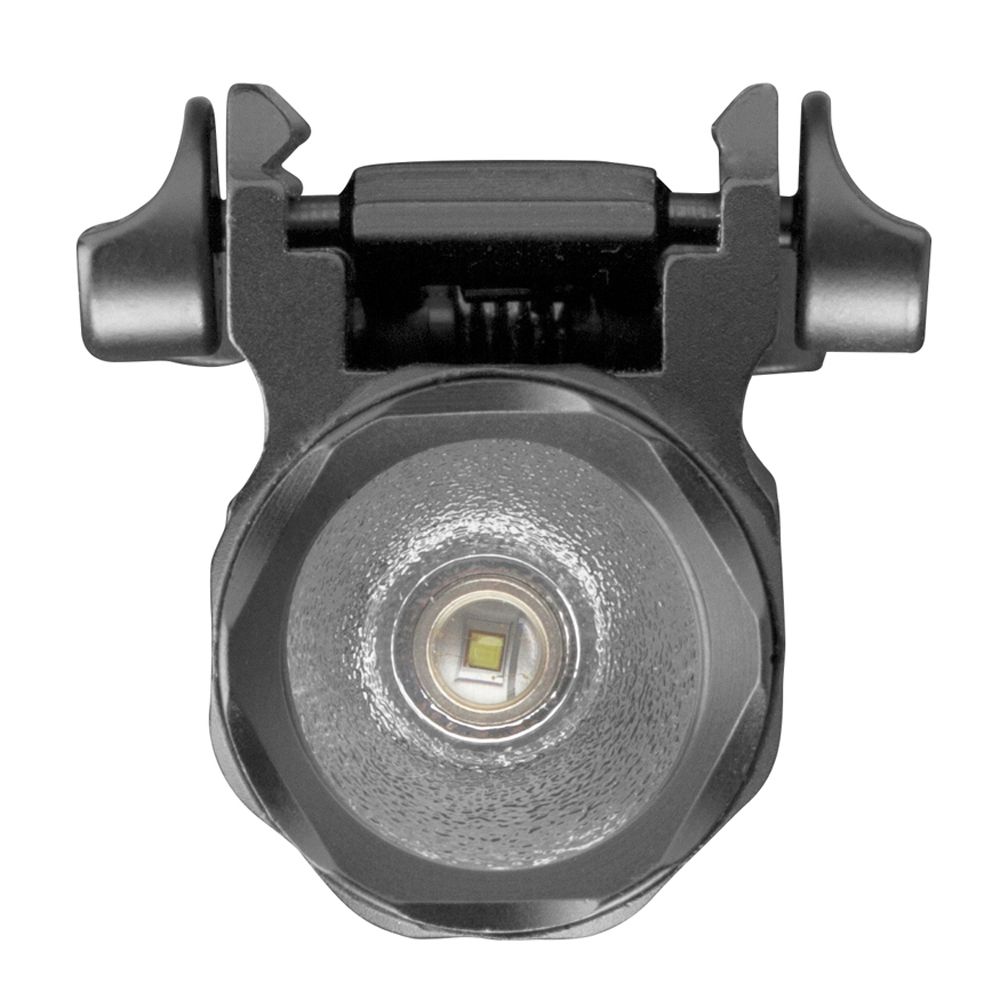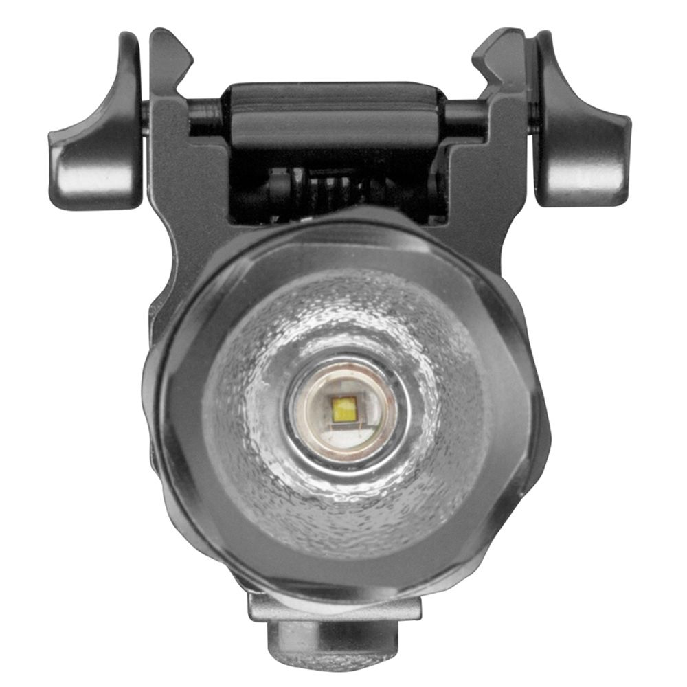 The 330 Lumens compact flashlight fits most full size pistol frames and rifles with Picatinny rail systems. Features include ambidextrous on/off switch and quick release attachment.