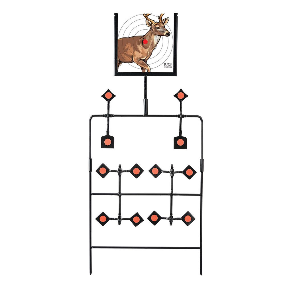 Comments: Keep your target practice fun with the Umarex Spinning Multishot Steel Target. This set includes spinning targets that will respond to your shots, and has a variety of opportunities for single and multi-player games. The four bottom targets spin horizontally, while the two mid-targets spin in a vertical direction. The top target is a standard fixed target. The stand itself is made of heavy duty steel and has sturdy ground stakes. 80 targets included.