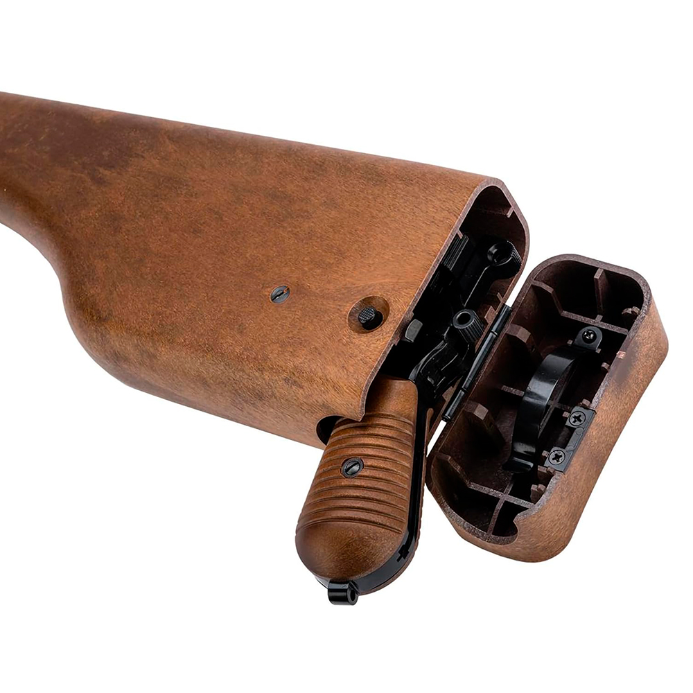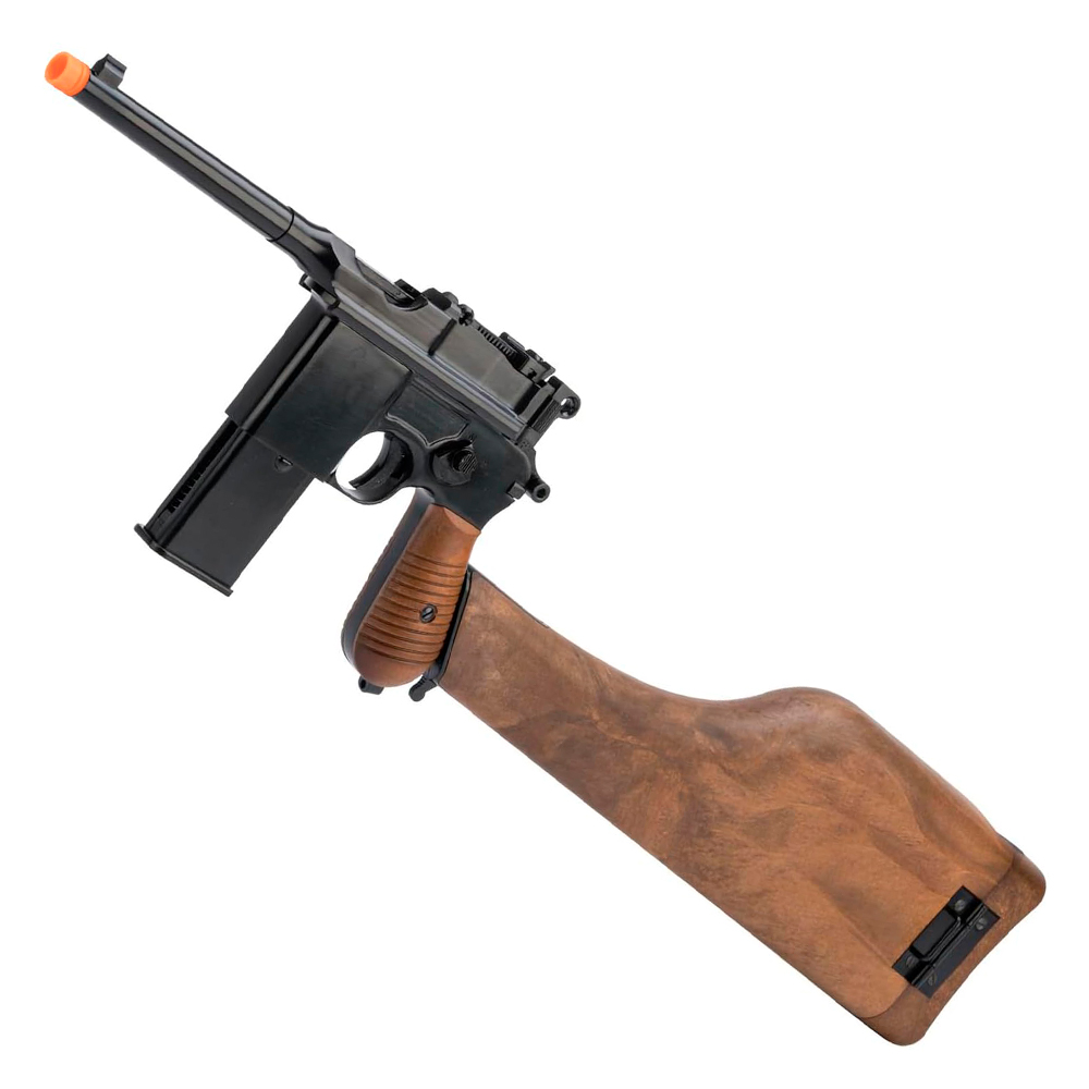 The realistic Mauser-style detachable stock, constructed from imitation wood and injection-molded polymer, not only provides a comfortable shoulder rest but also serves as a functional holster. The adjustable rear leaf sight enhances aiming accuracy, while the thumb safety adds an extra layer of security. With a muzzle velocity of approximately 1.01 Joules and a firing range of 400-450 FPS, this airsoft pistol delivers reliable performance in both semi-automatic and fully automatic modes.