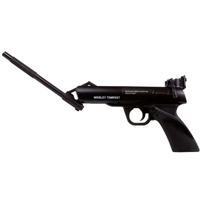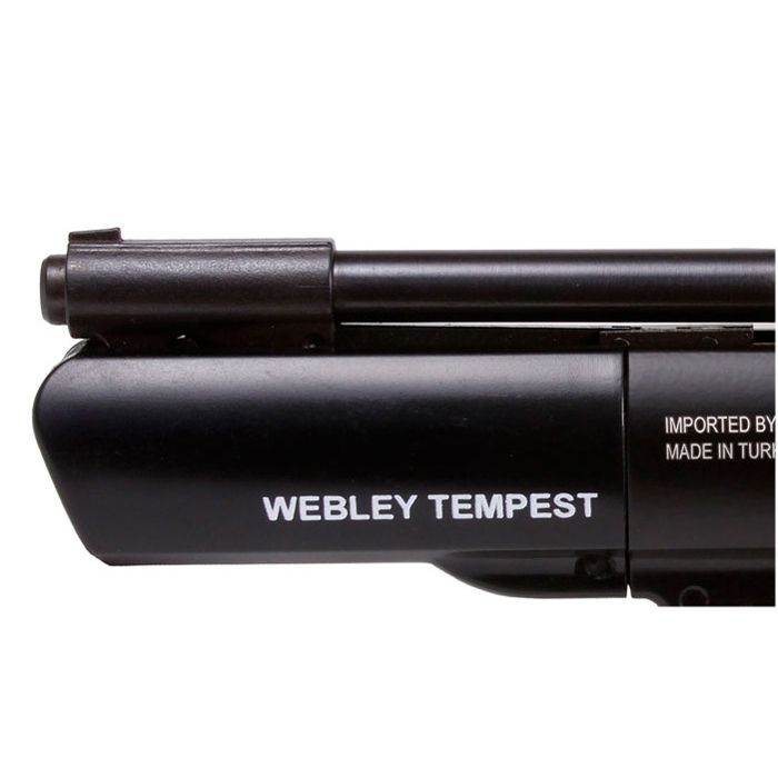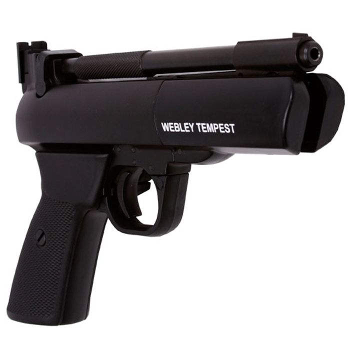 Type: Spring-piston air pistol Manufacturer: Webley Model: Tempest Materials: Mostly metal with minimal plastic parts Weight: 953g (2.1 pounds) Barrel: 175mm (6.9 inches), metal rifled Power Source: Spring-piston operated Action: Single shot Ammo Type: .177 caliber pellets Ammo Capacity: 1 pellet FPS: 400-499